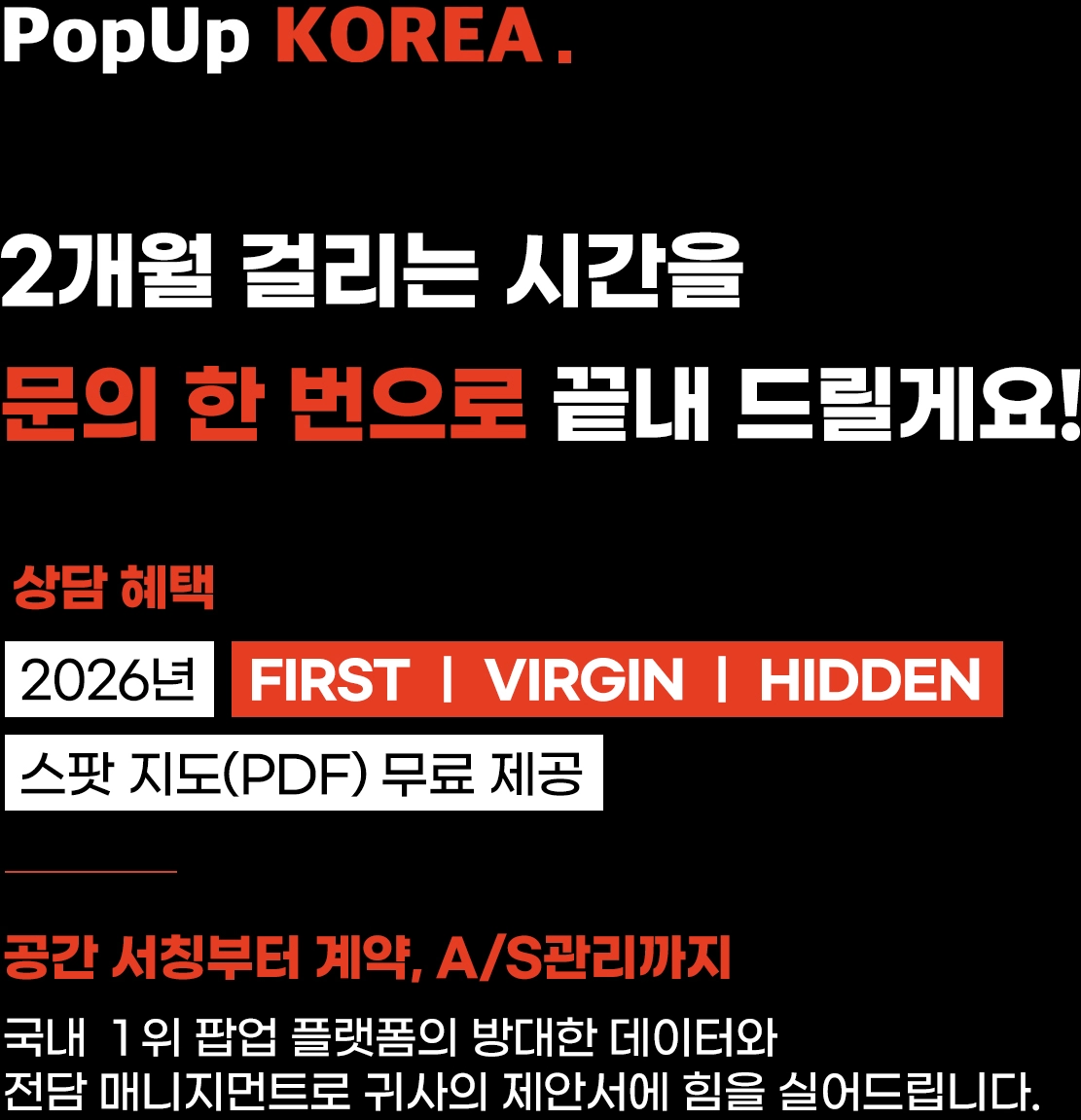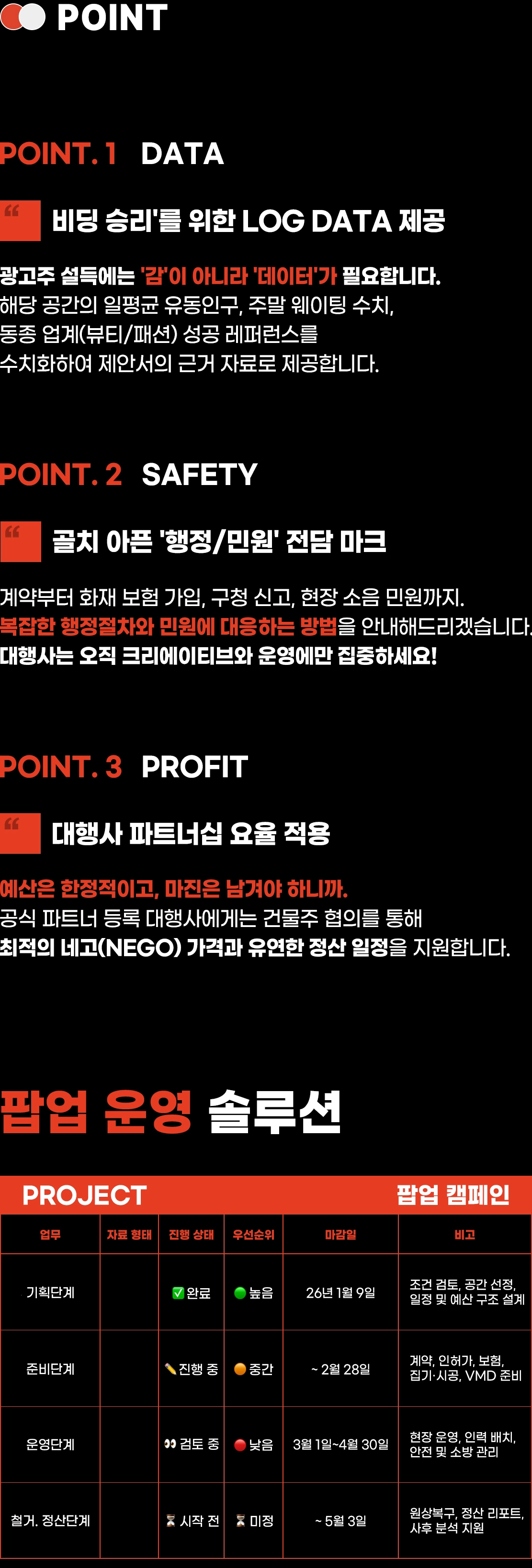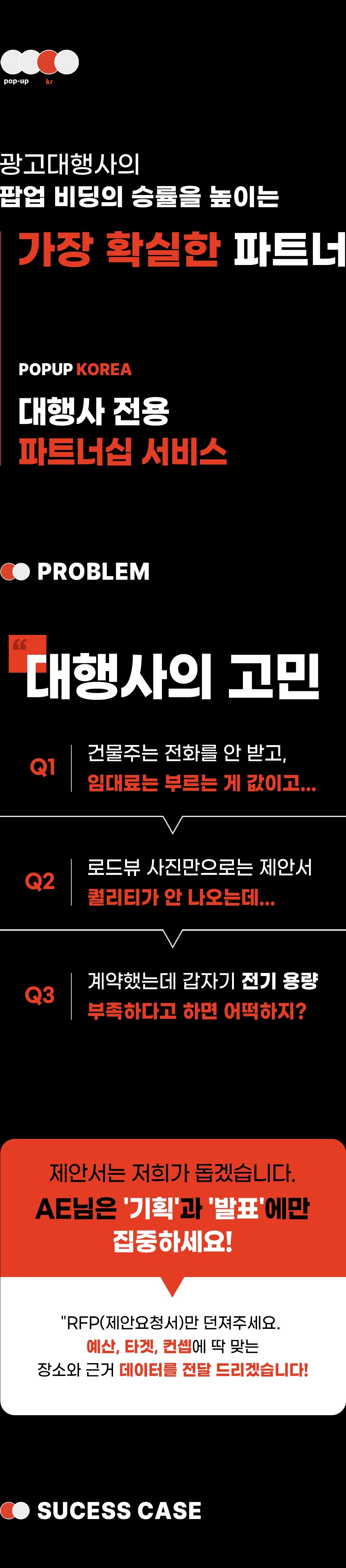 다양한 크기, 위치, 가격의 팝업공간을 제안하고 있어, 광고주의 다양한 요구사항에 유연하게 대처할 수 있습니다.